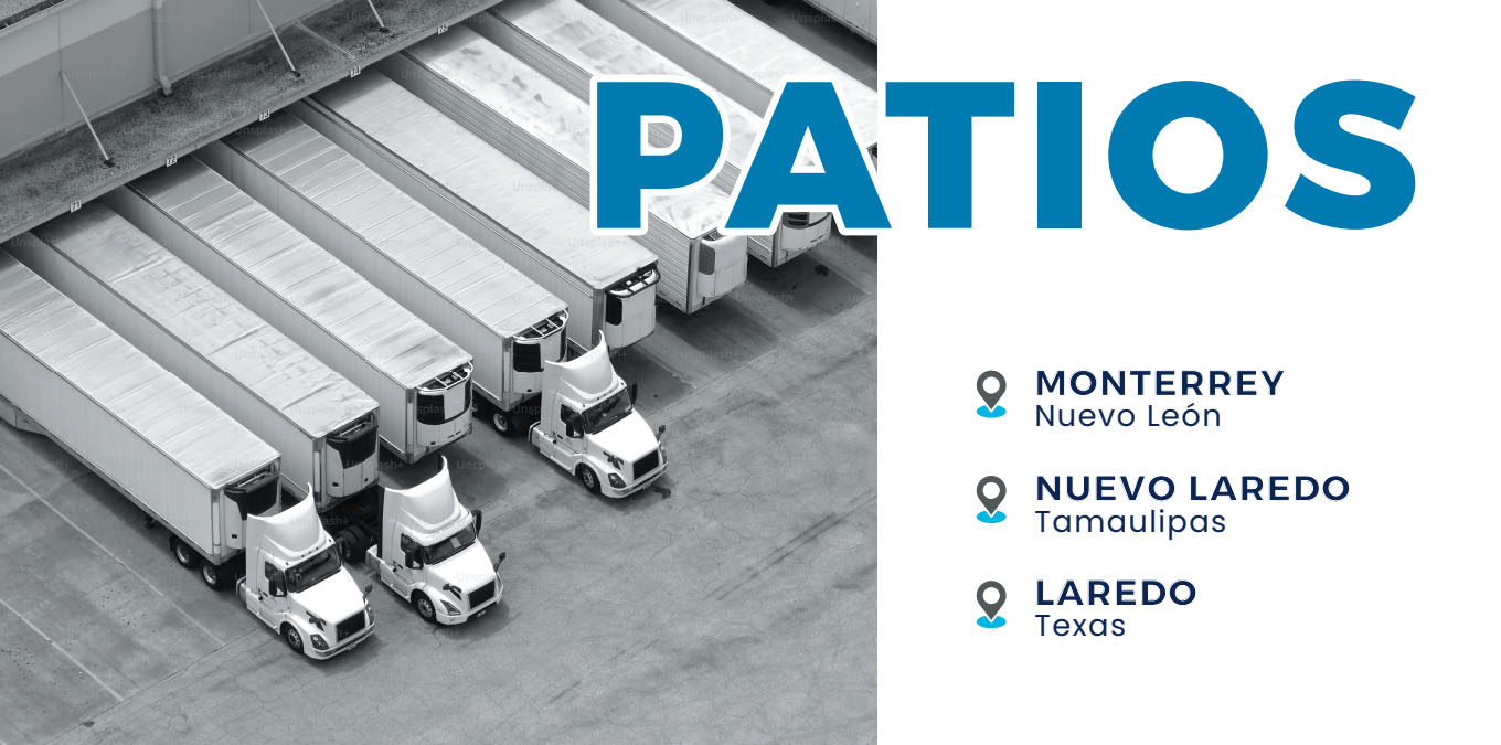Contamos con patios estratégicamente ubicados en Monterrey, Nuevo León; Nuevo Laredo, Tamaulipas; y Laredo, Texas, diseñados para optimizar la logística y el flujo de carga en la región.